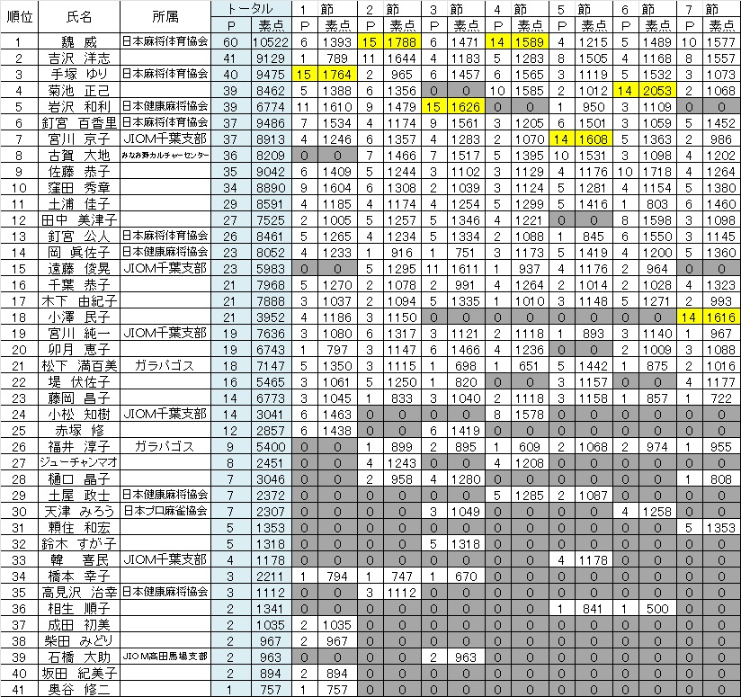 2025年10/26(日)西五反田にあります日本健康麻将協会五反田研修サロンにおきまして 第11期無双位戦第7節が開催されました。総合成績が並び替えられていなかった部分を修正しました(11/6修正)